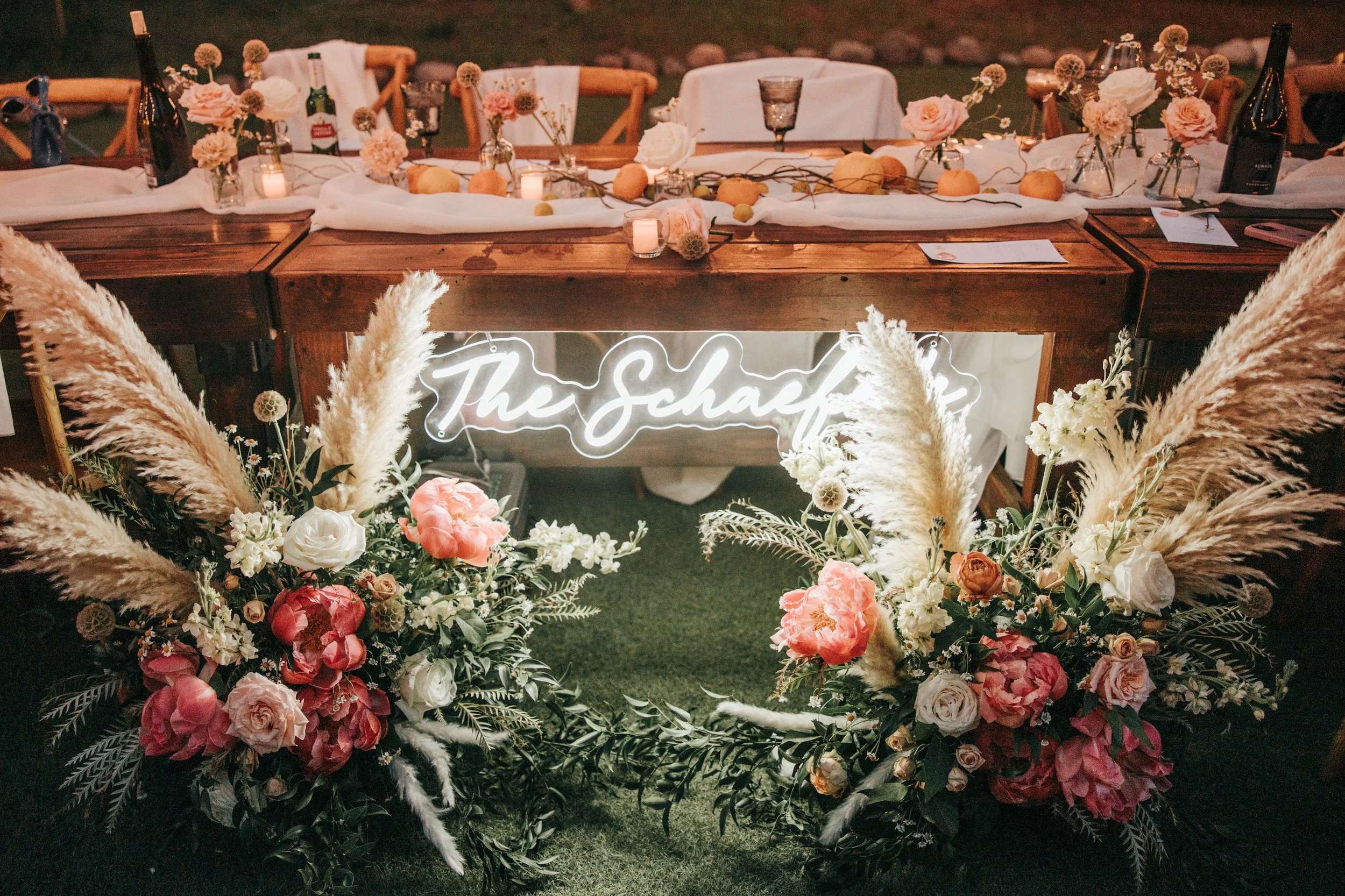 The ceremony itself was a heartwarming affair. The couple exchanged vows under a beautifully adorned brass arbor filled with preserved florals, bright tones, and added fruit symbolizing their commitment to a life filled with love, spontaneity, and adventure. The sun dipped low in the sky, casting a warm glow over the proceedings, as the couple's smiles illuminated the venue.