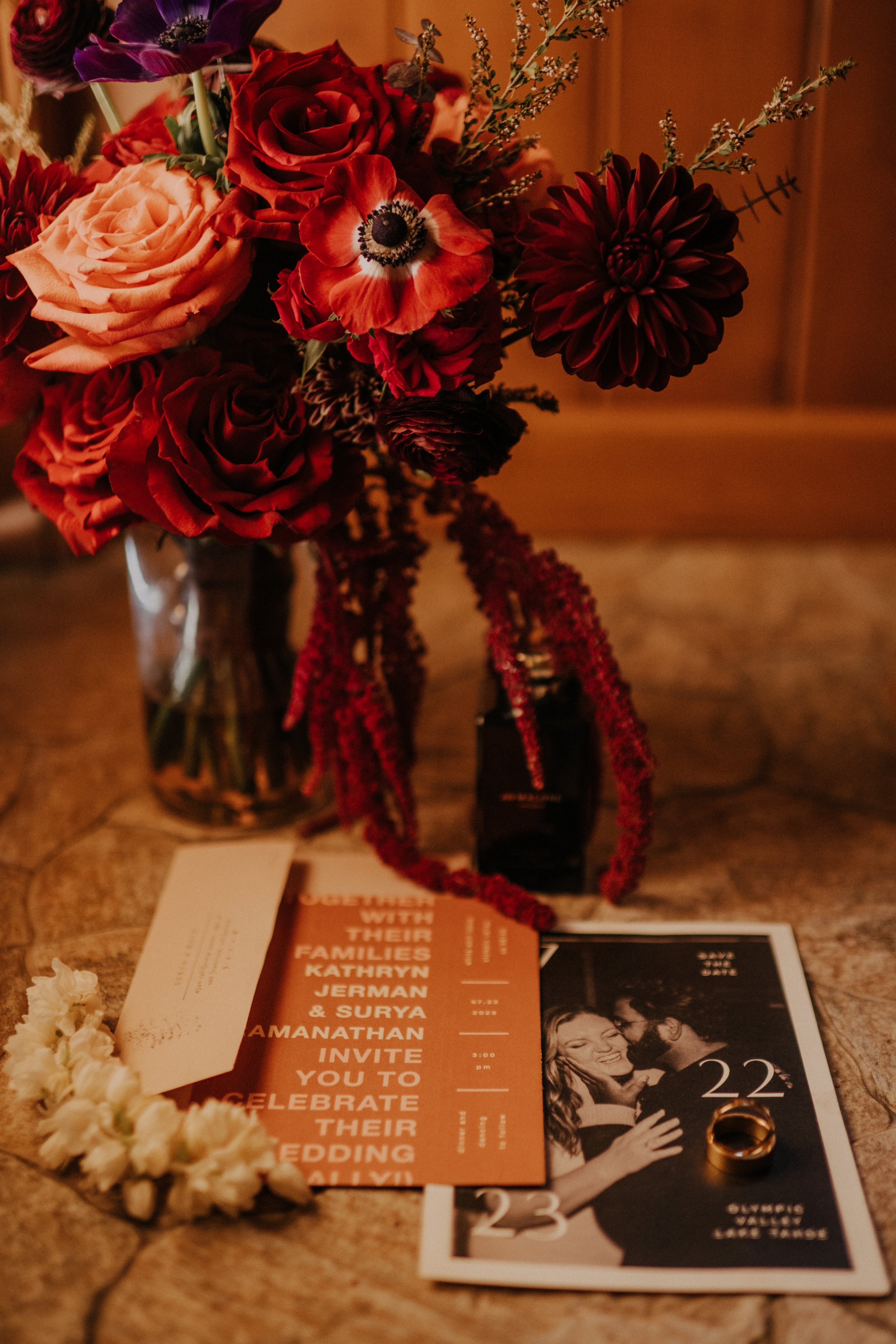 K + S wanted to – literally – marry the Indian culture meets Tahoe native and they chose the most stunning wedding palette of deep reds, oranges, pinks, and subtle drops of neutral. Kate’s bouquet was an all-time favorite. It’s not often you get to work with such vibrant colors for a bridal bouquet. This bouquet included dahlias, roses, anemones, mums, ranunculus, and hanging amaranthus with added calycina, and dyed eucalyptus.